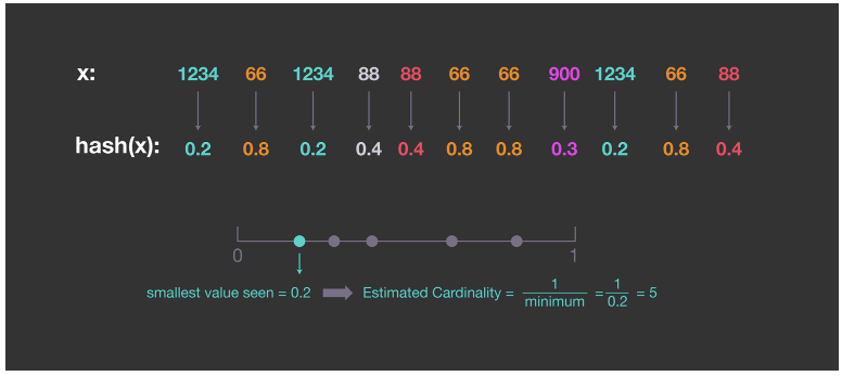 항목이 균등하게 분포되어 있으므로 집합의 최소값 ()을 구하고 고유 항목의 수를 으로 추정할 수 있다. 그러나 항목을 균등하게 분산하기 위해 해시 함수를 사용하고 항목 자체 대신 해시된 값으로 카디널리티를 추정할 수 있다. 아래는 해시 값이 정규화되어 0과 1 사이에 균일하게 분포된 간단한 예이다.