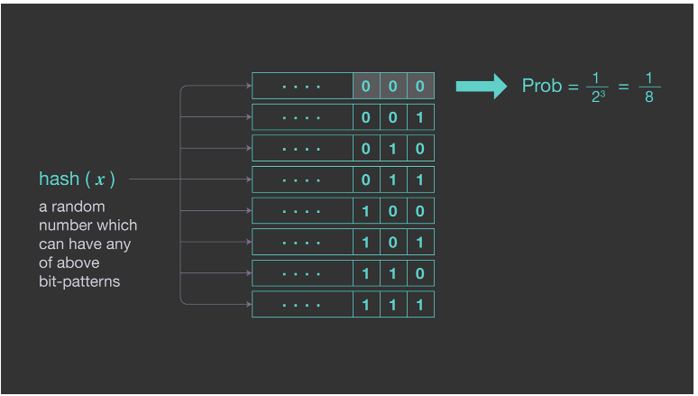 이전 방법의 높은 변동성을 줄이기 위해 해시값의 시작 부분에서 0비트 수를 세는 개선된 패턴을 사용할 수 있다. 이 패턴은 주어진 해시(x)가 최소 i개의 0으로 끝날 확률이 이기 때문에 작동한다. 아래 그림은 세 개의 연속된 0이 관촬될 확률을 보여주는 예이다.