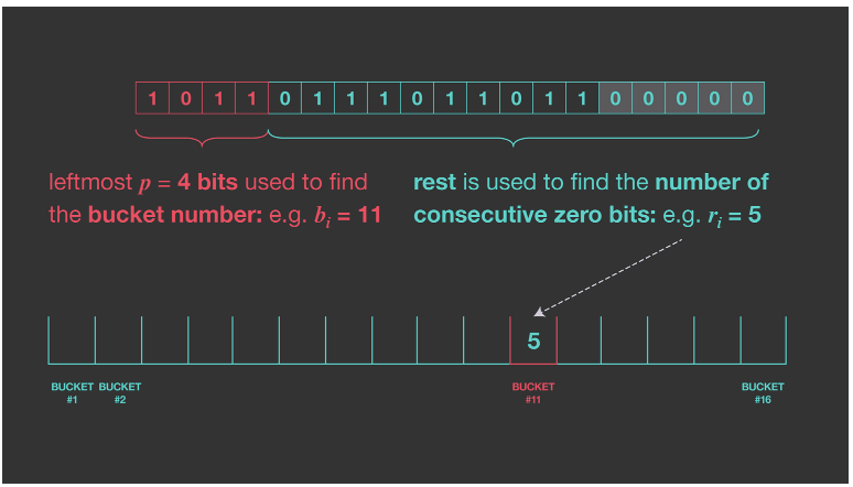예를 들어 hash(input)=101101101101100000일때 가장 왼쪽 4개(k = 4)의 비트를 사용해 버킷 인덱스를 찾는다. 그리고 나머지 오른쪽 비트에서 연속 0의 개수를 얻을 수 있다. 따라서 이 예에서는 버킷 11에 값을 5로 업데이트 할 수 있다.