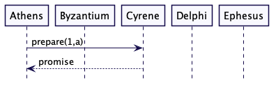 에페소스는 이제 키레네에게 준비 메세지를 보낸다. 키레네는 아테네에게 promise를 보냈지만 에페소스의 요청이 더 높은 generation이므로 에페소스의 요청이 우선된다. 키레네가 에페소스에게 promise를 다시 보낸다.