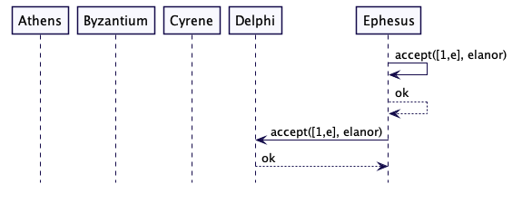 아테네가 “alice”를 제안하는 동시에 노드 에페소스는 이름을 “elanor”로 설정하라는 요청을 받는다. 따라서 에페소스도 제안자가 된다.