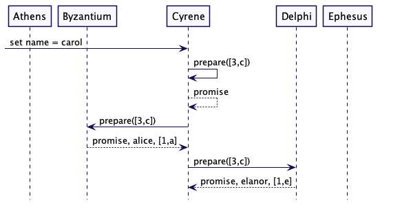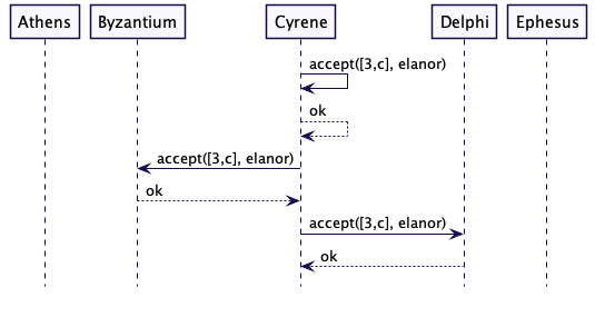 키레네는 클러스터의 나머지 노드에 준비 메세지를 보낸다. 아테네의 이전 준비 단계와 마찬가지로 키레네는 수락된 값을 받환받으므로 “carol”은 값으로 제안되지 않는다. 이전과 마찬가지로 델파이의 “elanor”는 비잔티움의 “alice”보다 늦기 때문에 키레네는 “elanor”와 [3,c]로 수락 단계를 시작한다.