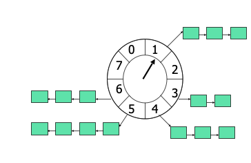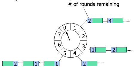 총 244개의 슬롯으로 864만개의 타이머 값을 처리할 수 있다. 휠에서 한바퀴를 돌 때 마다 다음 단위 휠이 한 슬롯씩 전진한다. 예를 들어 초 단위용 휠이 슬롯 0에 도달하면 분 단위 휠은 1로 움직여 해당 휠에 있는 정보를 가져와 초단위 휠을 재구성 한다.