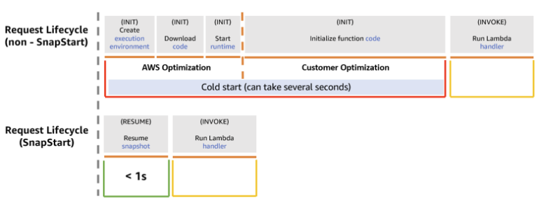Lambda의 경우 함수 초기화 단계에는 함수 코드 다운로드, 런타임 및 외부 종속성 시작, 함수 초기화 코드 실행 등이 포함된다. 하지만 snapstart와 같이 메모리 / 디스크 상태에 대한 스냅샷을 만들고, 암호화하여 캐싱하면 함수에 대한 시작 성능을 향상시킬 수 있다.