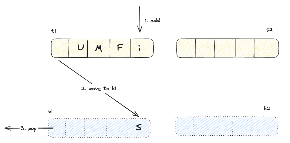 WTiny LFU 논문에서는 기존 LRU + frequency 조합의 알고리즘들인 ARC, LIRS 등에 대해 지적하고 있는 부분이 ghost entry problem이다. 이 문제를 살펴보기 위해 ARC 알고리즘을 먼저 살펴보자.