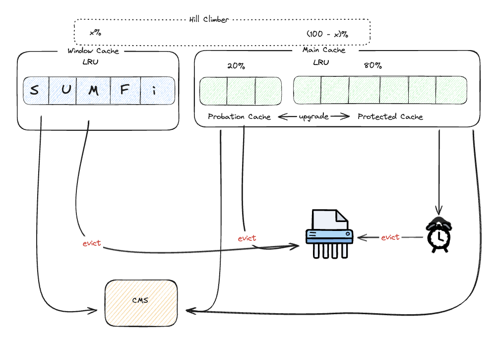 WTiny LFU는 크게 두 영역으로 나뉜다. 신규 엔트리를 위한 Window Cache 와 long lived entry 를 위한 Main Cache 역영이다. Main Cache 영역은 내부에서 2:8 비율로 Probation Cache 와 Protected Cache로 나뉘어서 관리된다.